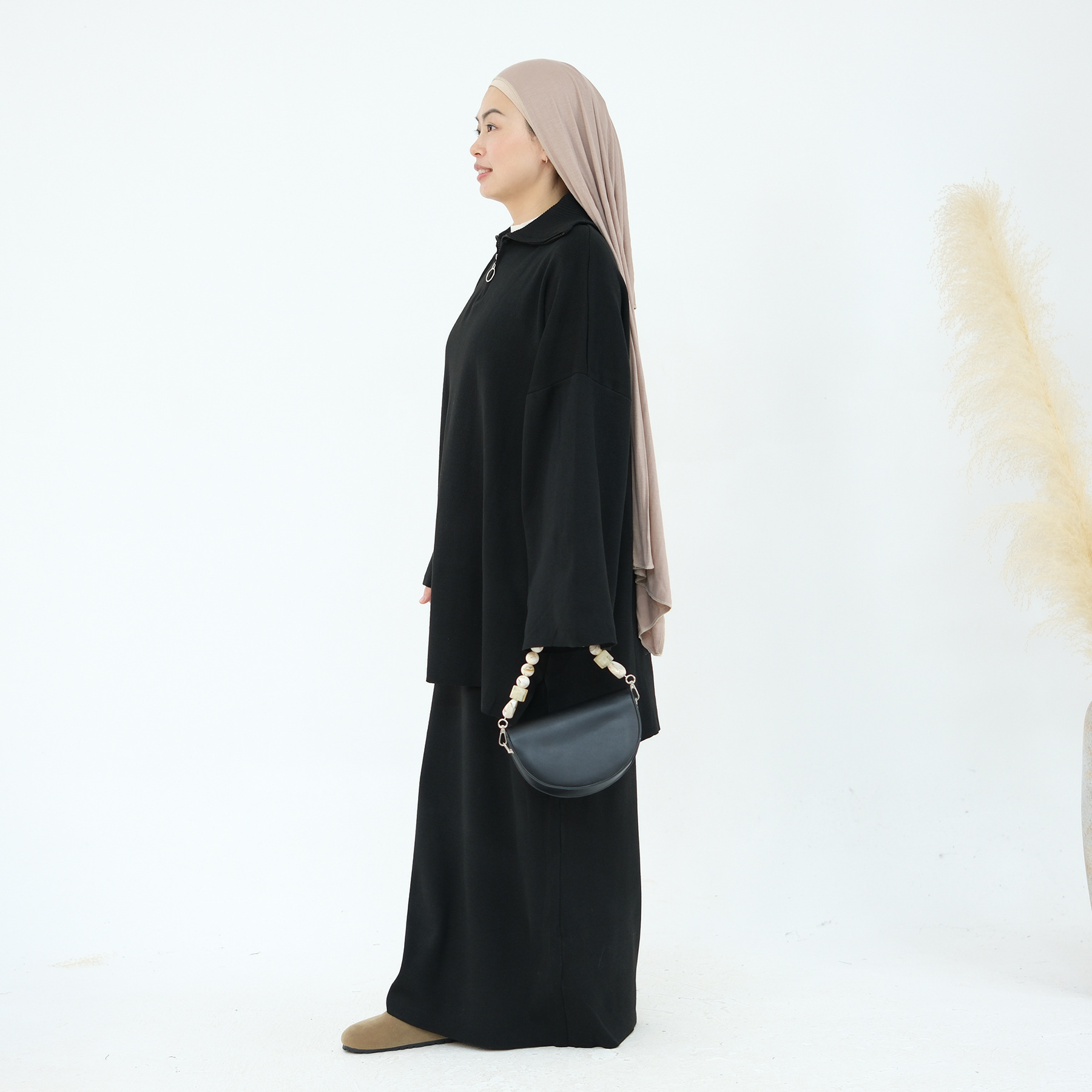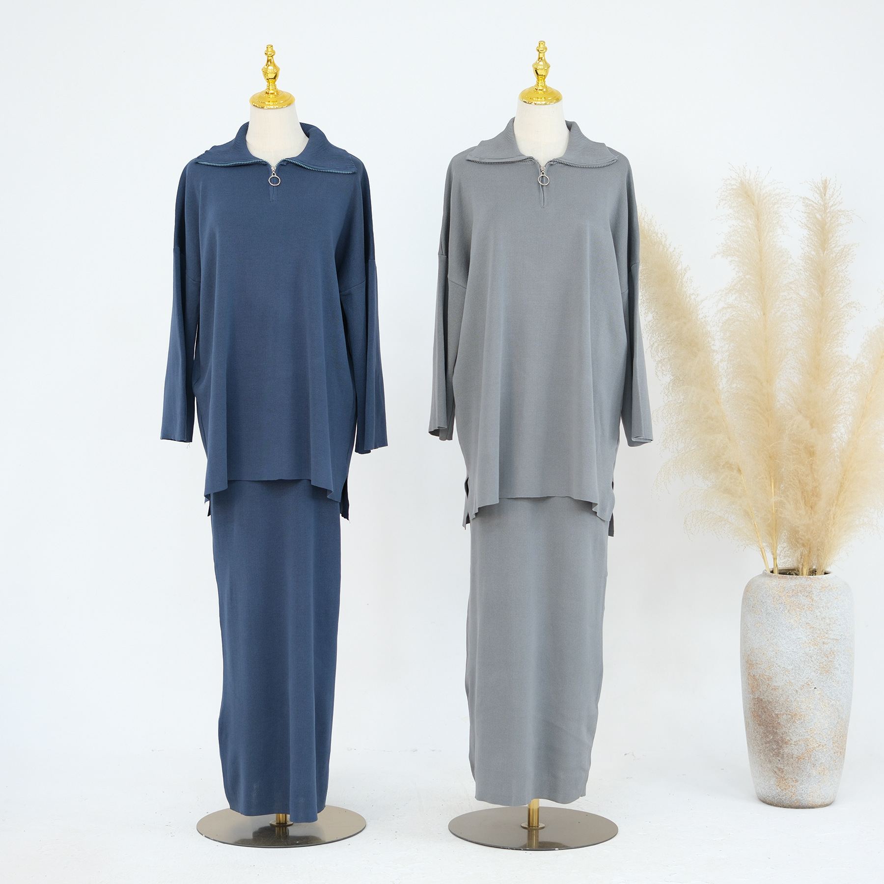 1929#Half Zipper Drop Shoulder Sweater Knit Muslim Women Two Pieces Set Oversized Tops Casual Fall Skirt Abaya Set